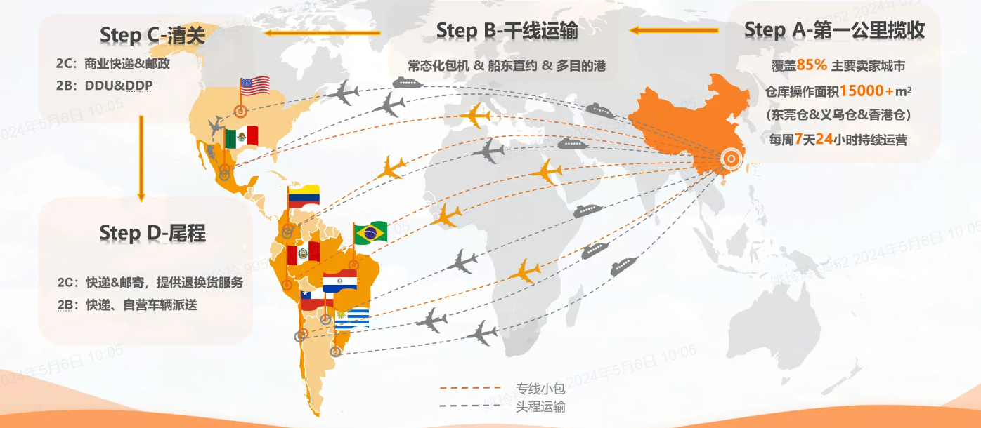 2016年启动墨西哥FBA服务,2018年开通拉美地区跨境小包服务,成为海外多家航司的中国独家总代理,中国至拉美常态化包机架次超200,开创行业先河。